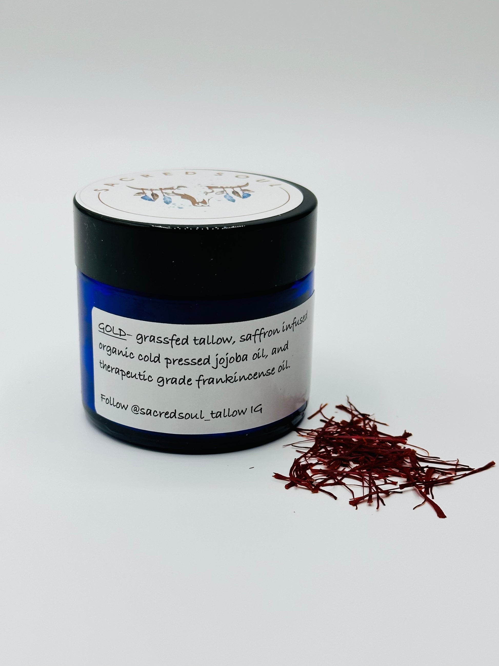 We use our grass fed, grass finished beef suet tallow, along with our in house saffron infused cold pressed jojoba oil, with an added kick of frankincense essential oil.