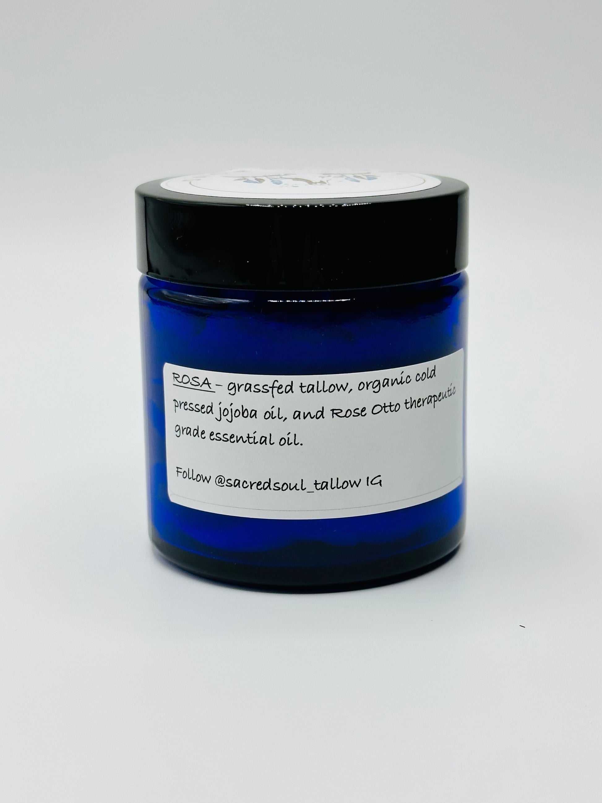 In this amazing blend, we use our sumptuous grass fed, grass finished beef suet tallow, combined with Rose Otto essential oil, and our cold pressed hexane free jojoba oil.